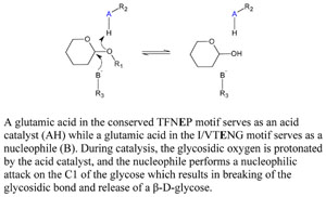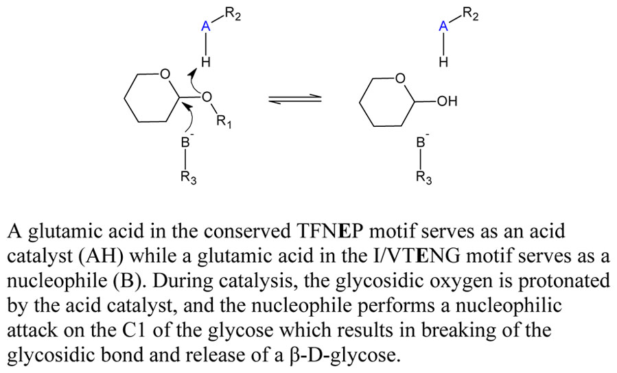 β-glycosidases belong to the Glycosyl Hydrolase Family 1 <http://afmb.cnrs-mrs.fr/CAZY/fam/GH1.html>. They catalyze the hydrolysis of the glycosidic bond between the anomeric carbon and the glycosidic oxygen by a mechanism in which the anomeric conformation of the glycose is retained.