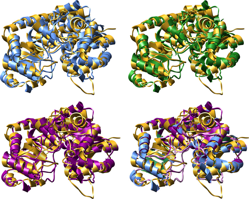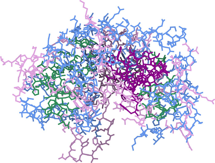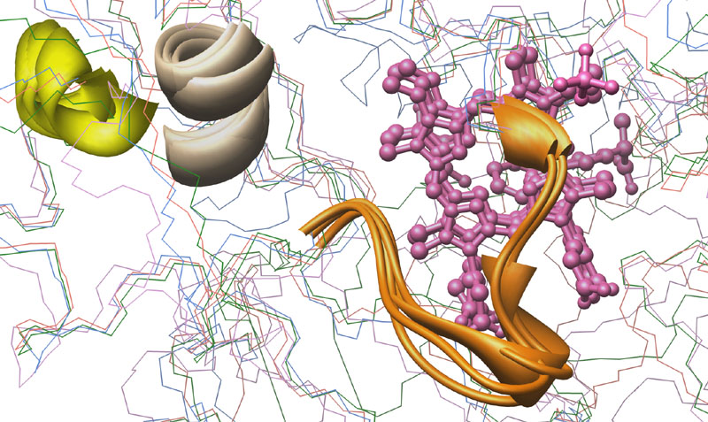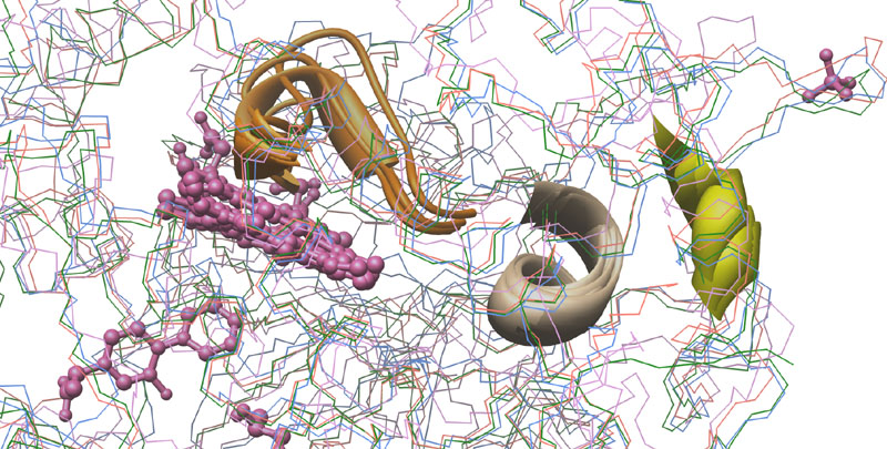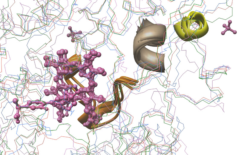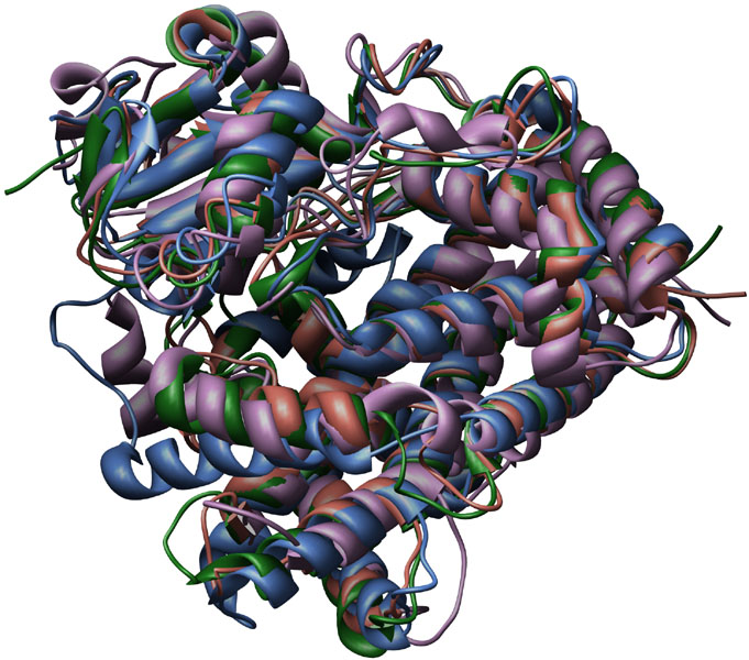 Consensus Matching of 4 Cytochrome P450s as ribbon-structures. P450s and Colors: CYP3A4 [1TQN, Homo sapiens], purple; CYP2B4 [1PO5, Oryctolagus cuniculus], blue; CYP2C5 [1DT6, Oryctolagus cuniculus], rose; CYP2C9 [1R9O, Homo sapiens], green.