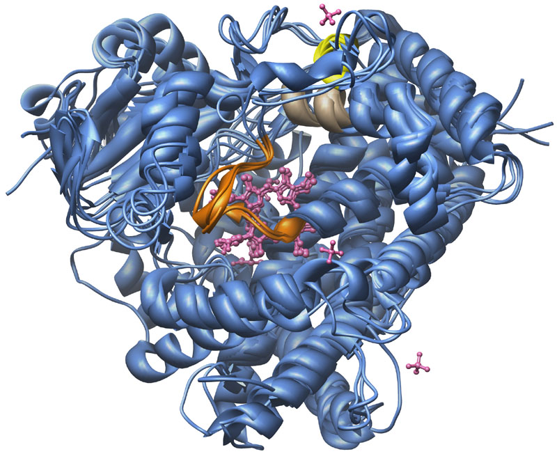 Consensus Matching of 4 Cytochrome P450s as ribbon-structures with bound ligands. P450s: CYP3A4 [1TQN, Homo sapiens], CYP2B4 [1PO5, Oryctolagus cuniculus], CYP2C5 [1DT6, Oryctolagus cuniculus], and CYP2C9 [1R9O, Homo sapiens]. Color key: P450 backbone structures, blue; K-helix consensus, brown; PERF consensus, yellow; heme-binding domain, orange; bound ligands ( heme [all], flubiprofen [CYP2C9], glycerol [CYP2C9], Samarium ion [CYP2C5], Sulfate ion [CYP2C5]), pink.
