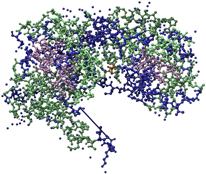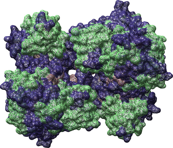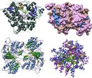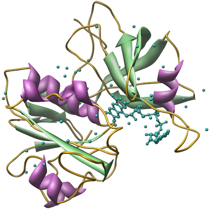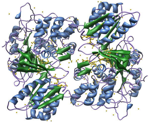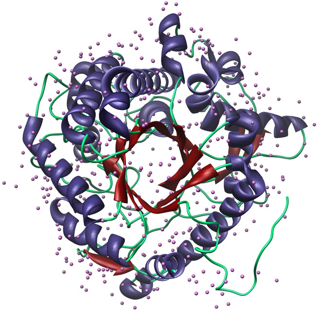 Cyanogenic Betaglucosidase [1CBG] from Trifolium repens, ribbon-structure with water. Color key: helix structures, purple; strand structures, red; backbone, green; water, light purple.