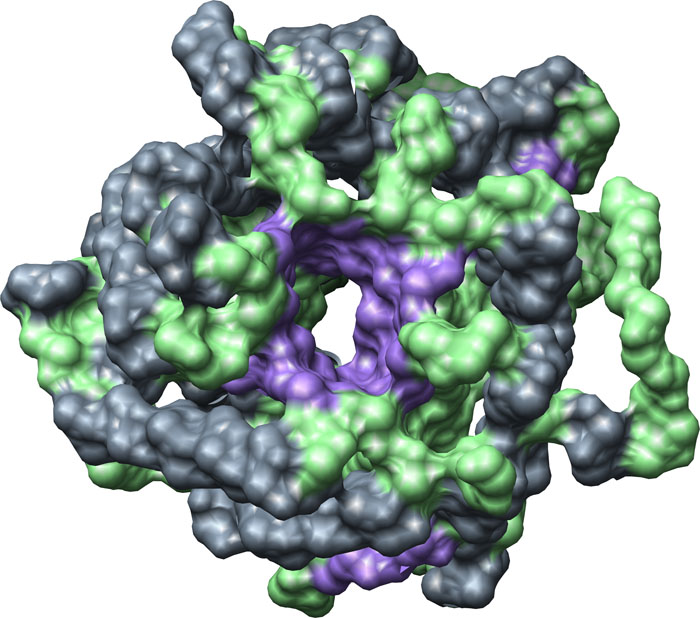 Putative Betaglucosidase from Oryza sativa, structure predicted by AL2TS, solid surface structure. Color key: helix, grey; strand, purple; backbone, green.