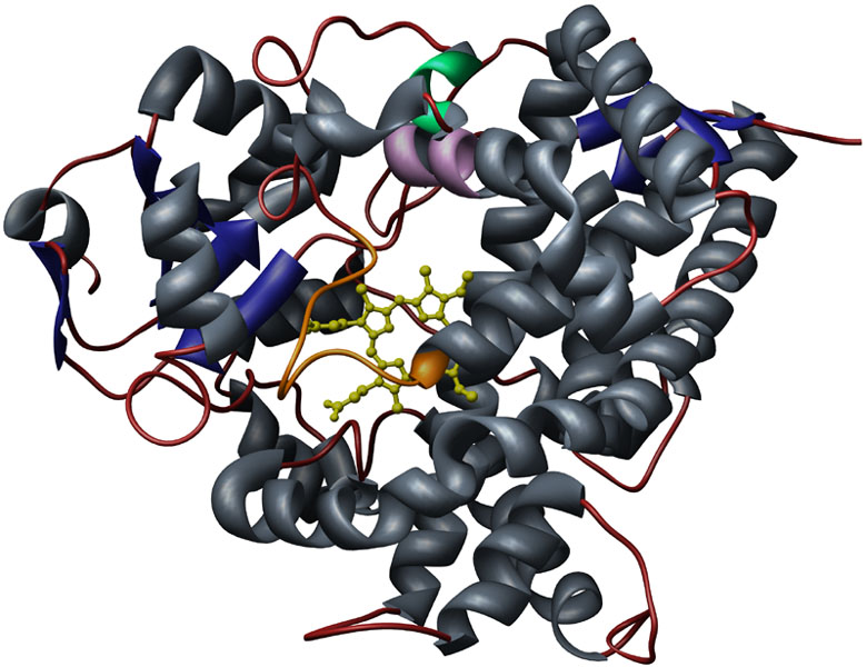 CYP3A4 [1TQN, Homo sapiens] ribbon detail. Color key: helix structures, gray; strand structures, blue; PERF consensus, green; K-helix concensus, purple; heme-binding consensus, orange; heme ligand, yellow.