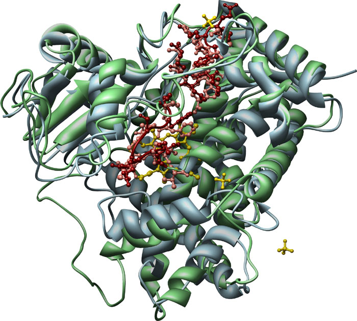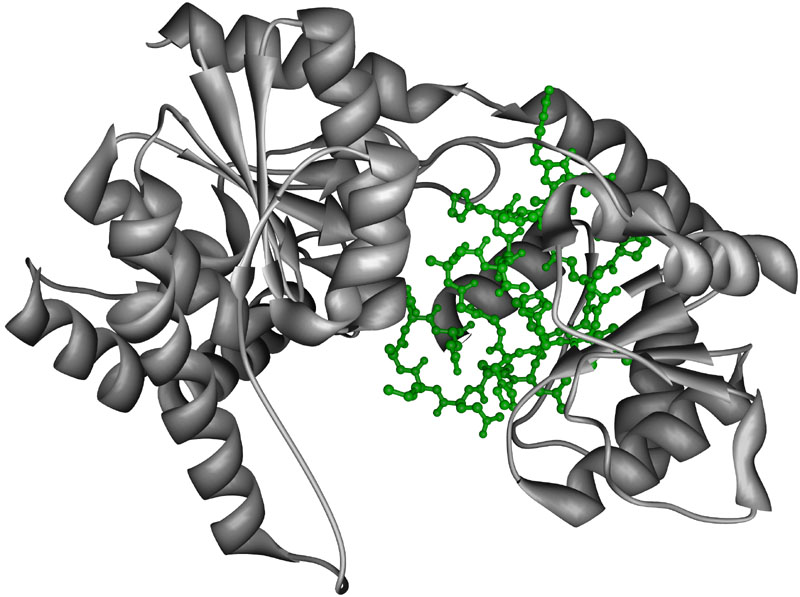 UDP-Glucosyltransferase Gtfb [1IIR] from Amycolatopsis orientalis, ribbon and ball-and-stick structure with PROSITE consensus sequence. Color key: main structure, grey; PROSITE consensus, green ball-and-stick.