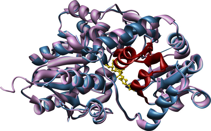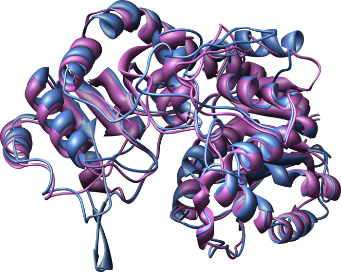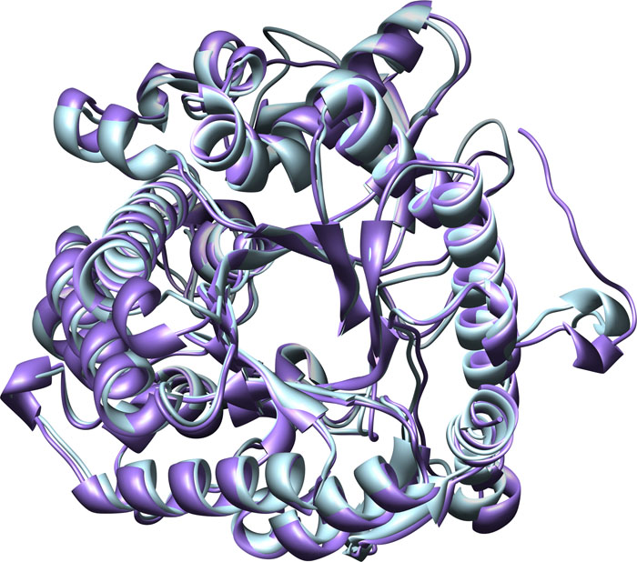 Consensus matching of Cyanogenic Betaglucosidase [1CBG] from Trifolium repens and Dhurrinase 1 [1V02] from Sorghum bicolor, ribbon structures. Color key: Dhurrinase 1 [1V02], blue; White clover Cynogenic BGD, purple.