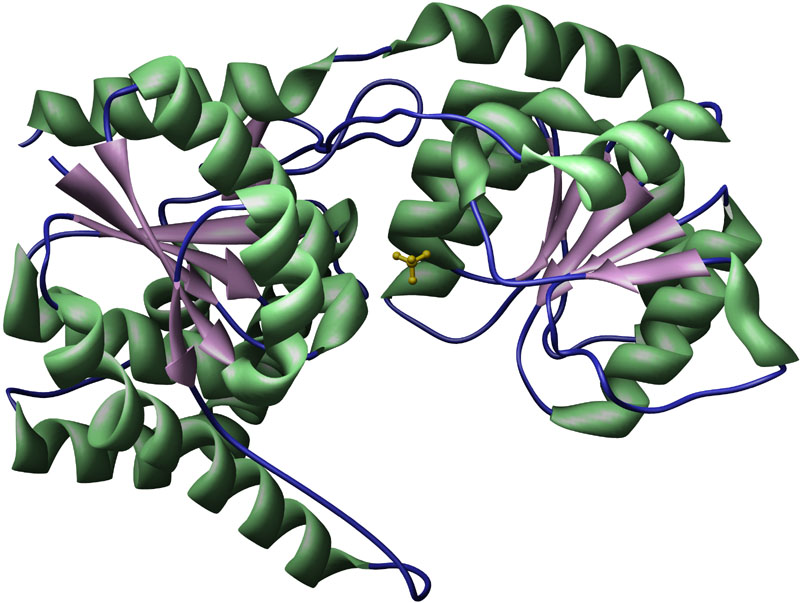 UDP-Glucosyltransferase Gtfb [1IIR] from Amycolatopsis orientalis, ribbon-structure with ligand. Color key: helix structures, green; strand structures, purple; bound ligands (Sulfate ion, Magnesium ion), yellow.