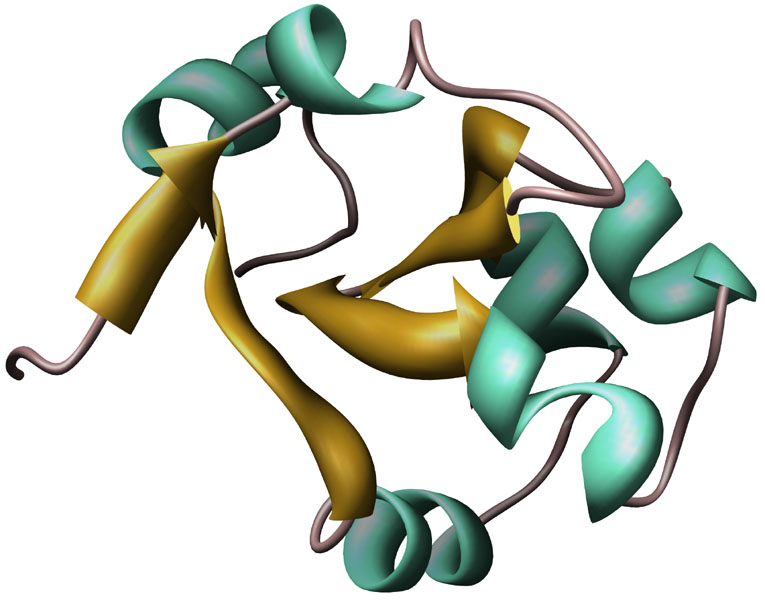 Cytochrome b5 [1B5B, Rattus norvegicus] ribbon structure. Color key: helix, blue; strand, gold.