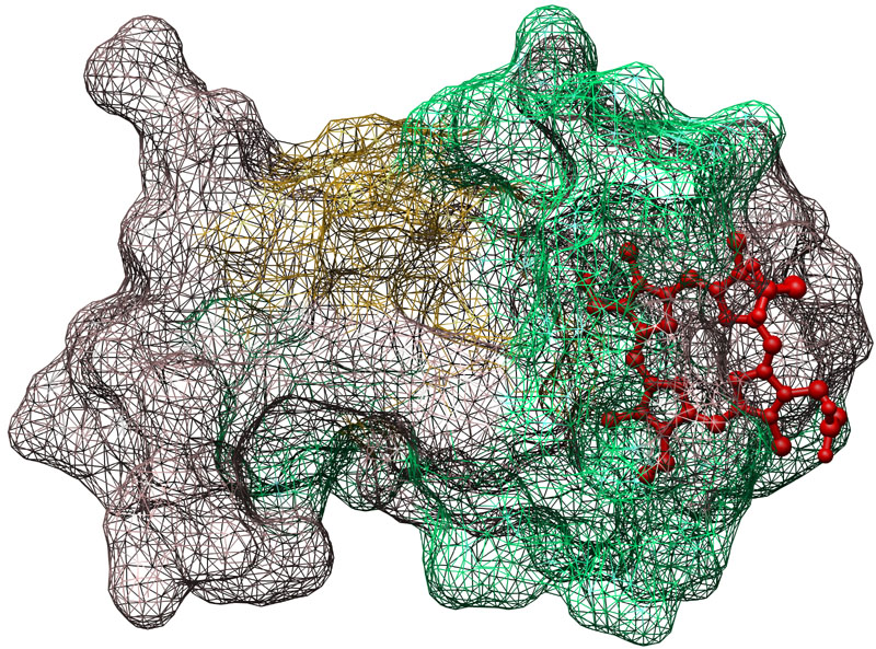 Cytochrome b5 [1B5M, Rattus norvegicus] mesh surface structure with ball-and-stick ligand. Color key: helix, green; strand, gold; bound ligand (heme), red.